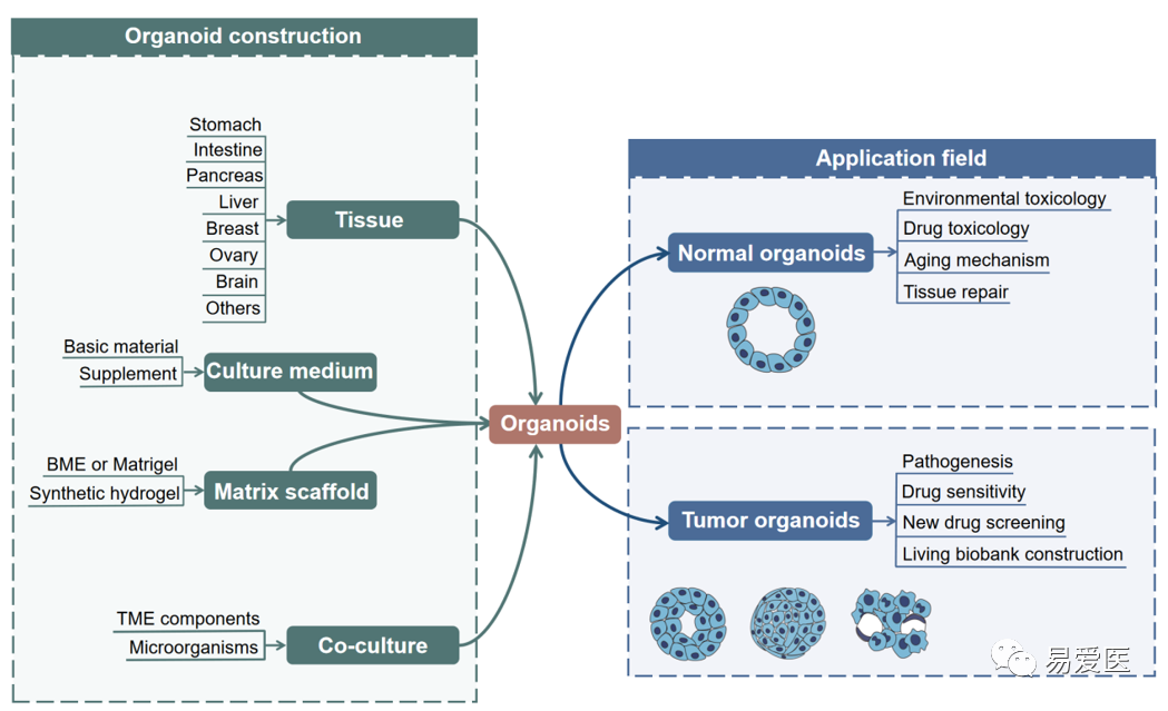 圖示:類器官的構(gòu)建及應用概覽圖。左側(cè)展示了類器官構(gòu)建的核心要素,如組織采集、培養(yǎng)基、基質(zhì)生物材料和共培養(yǎng)體系等;右側(cè)展示了正常組織源性類器官與腫瘤源性類器官的不同用途。